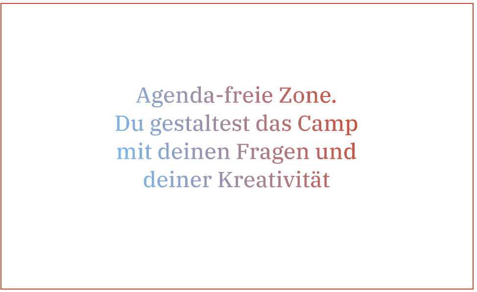 Im AgenturCamp gibt es keine Zuschauer. Du bist Mitspieler:in. Hier kannst du dich einbringen, so wie du bist. Mit deinen Fragen, Ideen und Erfahrungen. Jedes Camp ist ein Unikat, weil die Menschen, die Themen, die Location jeweils einmalig sind. Gestalte gemeinsam mit allen Camper:innen die persönlichen Begegnungen als echten Höhepunkt, der weit über den Moment hinaus wirkt.