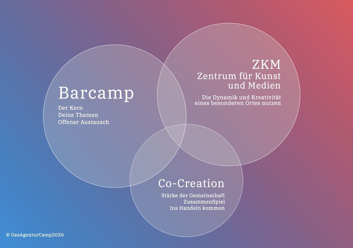 Das ZKM ist der perfekte Rahmen für DasAgenturCamp 2026. Der Kern Barcamp ergänzt durch einen radikalen  Perspektivenwechsel. Die Chance Methoden, Denkweisen und Arbeitsformen kennenzulernen und zu übernehmen, mit denen das ZKM seit Jahrzehnten erfolgreich Transformation bewirkt.