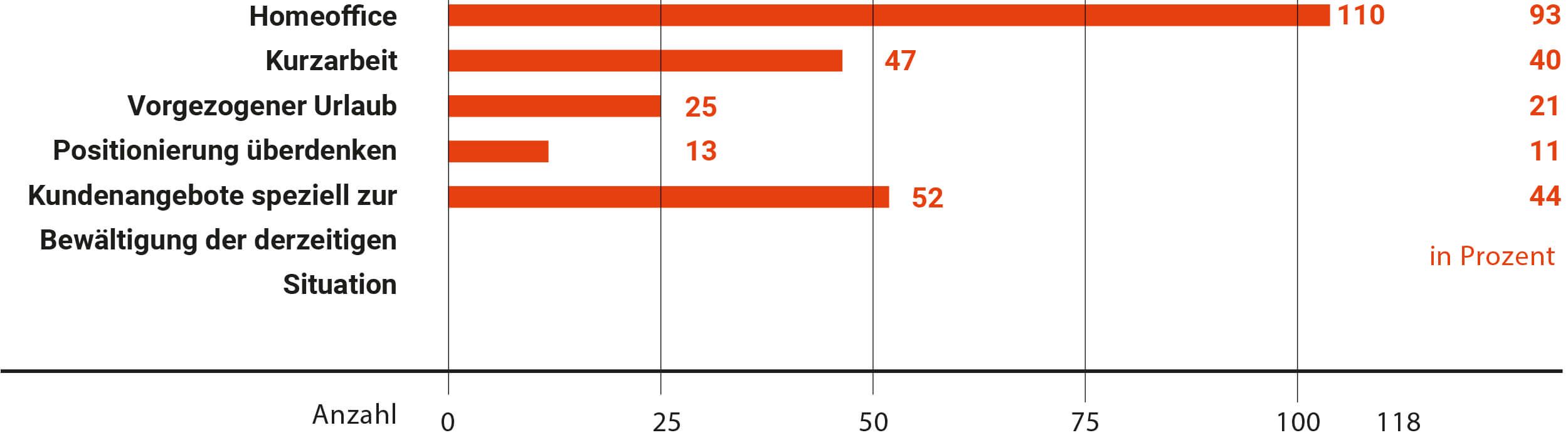 So gut wie alle Agenturen haben auf Home-Office umgestellt. Schon rund 40 % nutzen Kurzarbeit. Über 40 % bieten ihren Kunden gezielt Unterstützung zur Bewältigung der Situation und gut 10 % überdenken gerade ihre Positionierung. Weitere Aktivitäten sind vorgezogener Urlaub für Mitarbeiter, Entlassungen, Steuerstundungen oder das Beantragen von Darlehen.